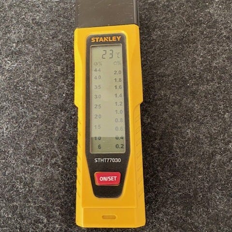 ACCSACK MT210 fuktmätare i handhållet utförande. Enheten drivs med 9V-batteri och har lysdioder som visar fuktnivå i procentsteg från 8 % till 22 %. Mätaren är avsedd för snabb kontroll av fuktinnehåll i material och är enkel att använda med en tydlig knapp på framsidan samt indikatorer för drift och batteristatus.