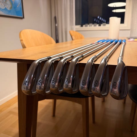 Säljer mitt järnset då jag är sugen på något nytt. Det är precis som det står i rubriken ett Mizuno JPX 923 HM Pro 5-Pw: Stiff järnset i riktigt bra skick. Jag har haft det i en sommar och den ända skavanken som finns är ett litet märke från en sten på J8 (se bild), det är ingenting som påverkar bollträffen eftersom märket sitter under huvudet. Finns att hämtas i Täby. Bara att höra av sig vid frågor.