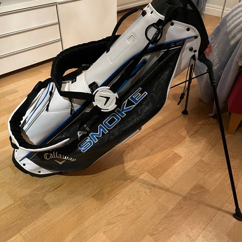 Taylormade bärbag i ett okej skick. Synligt använd vid toppen där det gått sönder. Kanske kan man sy ihop det om man är händig. Inget jag orkat försöka mig på. Annars schysst dragkedjorna funkar och regnhuvan följer med.
