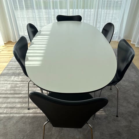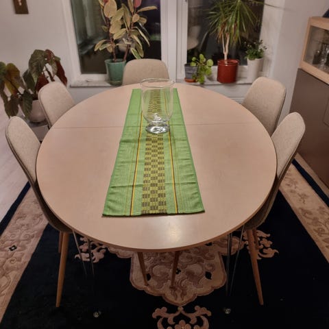 en tunn kant i trä. Benen är i blank metall och sitter i grupper om flera rör, vilket ger ett lätt och öppet intryck under bordet. Passar som matbord i kök eller vardagsrum och rymmer lätt 10 stolar runt om bordet.