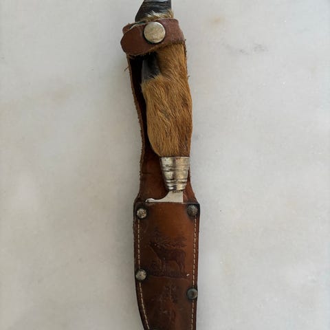 Jaktkniv med fast blad och brun knivslida i läder. Handtaget är utformat i ett material som efterliknar horn eller trä med tydlig struktur och har en rund dekorativ bricka infälld. Bladet är märkt med text som anger att kniven är tillverkad i Tjeckoslovakien. Slidan är brun med präglat motiv och är försedd med nitar och bältesfäste. Kniven kan användas som allroundkniv för friluftsliv eller jakt.
