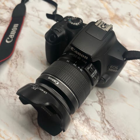 Canon digital systemkamera i svart utförande. Kameran är en digital spegelreflexkamera (DSLR) med avtagbart objektiv och rem med Canon-logotyp. Passar för allmän fotografering, exempelvis vardagsbilder, resor och enklare hobbyfotografering. Fungerar tillsammans med kompatibla Canon-objektiv och tillbehör för digitala systemkameror.
