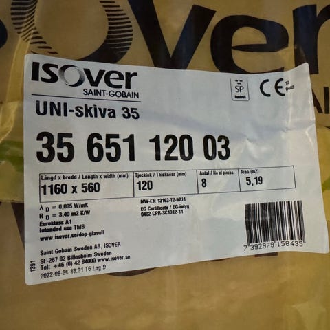 Drygt 2 skivor isolering kvar i paketet. Flexibatts. Ingen prutning tack.