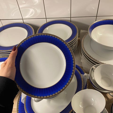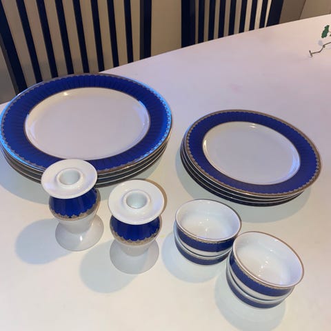 6 mattallrikar, 6 assietter. Såsskål med fat, salt och pepparkakor. 3 ljushållare.