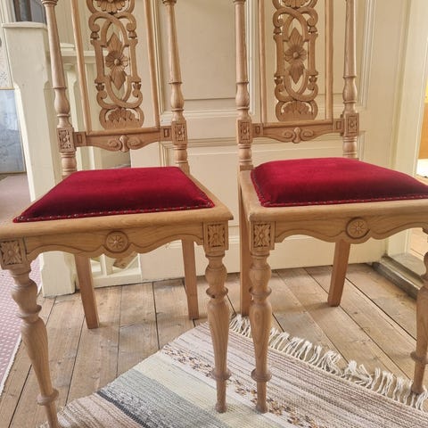 Fyra stolar. De är i bra skick, men några små märken här och där. Tyget är sammet eller något i den stilen.