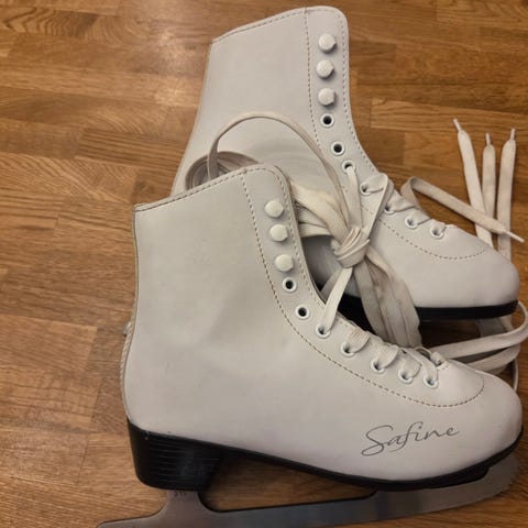 Revolution Spin skridskor i storlek 39. Vit modell med snörning och svart klack. Blad i metall med märkning 250. Invändigt foder i mjukt, luddigt material för ökad komfort och värme. Säljes med svarta skydd. Mycket gott skick använda ett fåtal gånger! Passar för allmän åkning och övriga skridskoaktiviteter.