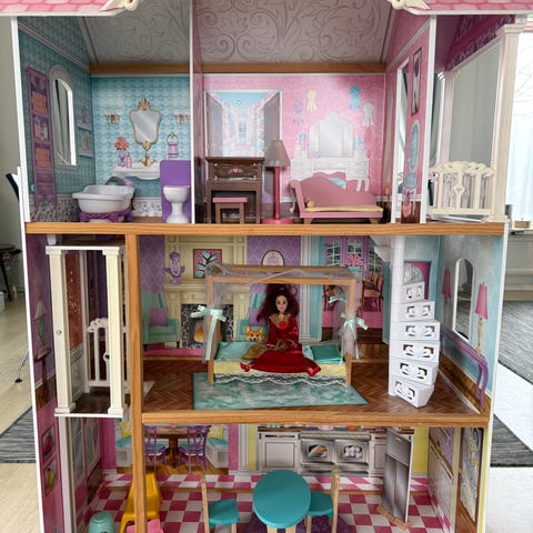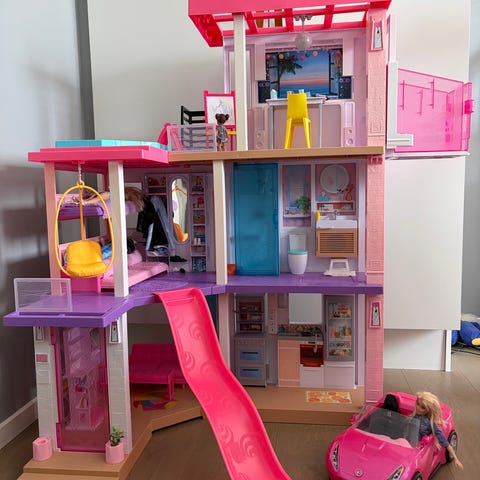 Barbie dockhus i rosa färg med flera våningar och rum. Huset har detaljerad inredning med tryckta väggmotiv, trappa mellan våningsplanen samt öppna rum på framsidan för lek. Passar för Barbie-dockor och liknande dockor i liknande storlek. Dockhusets utformning gör det lämpligt för rollekar och inredningslek i barnrum.