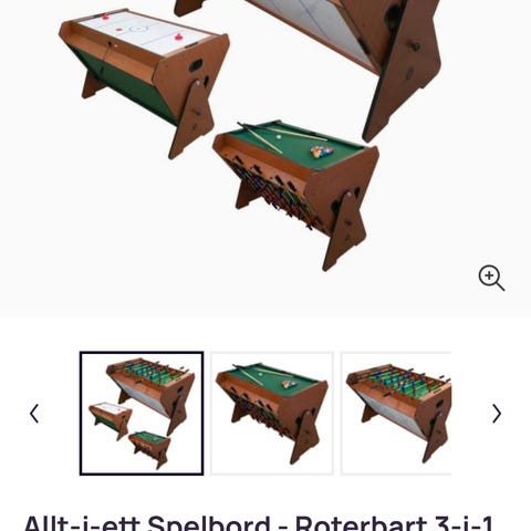 Multispel spelbord med flera olika spel i ett bord. Bordet har överdelar för fotbollsspel, biljard, airhockey och bordtennis. Bordet står på fyra ben och är avsett för inomhusbruk.