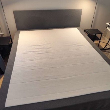 Sängen är i gott skick, madrassöverdraget har fläckar på ena sidan och är rent på den andra, mellanmadrassen består av två delar och har tyg, OBS!-men efter tvätt i tvättmaskin lossnade låset från tyget (detta kan göras i vilken verkstad som helst, det är inte dyrt), eller så kan man använda låset utan att låsa det.