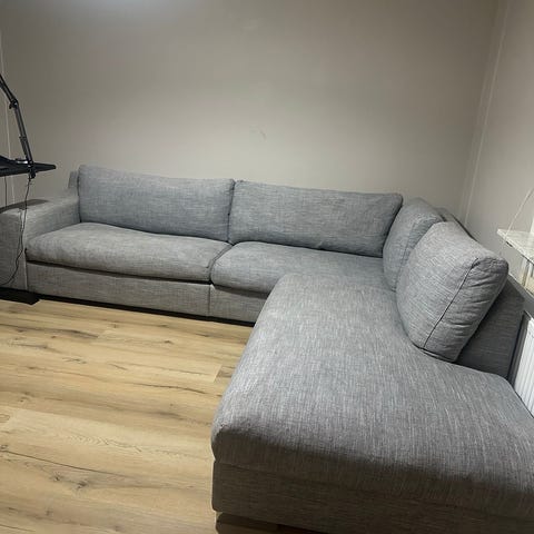 En stor ljusgrå divan-soffa med cosy corner och schäslong från Mio.