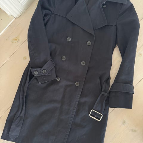 Esprit kappa för dam i svart färg. Storlek M. Tillverkad i polyester med dubbelknäppning framtill. Avtagbart skärp i midjan och justerbara remmar vid ärmsluten. Kappan har sprund bak och quiltat innerfoder. Passar som ytterplagg under svalare väder.
