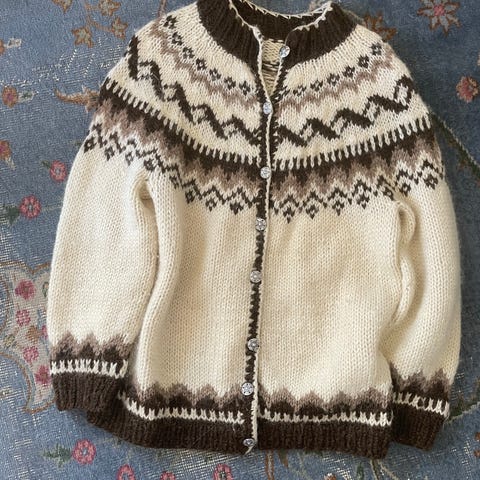 Världens finaste handstickade vintage kofta i Ull. Jätte fint skick. Färgen har den mest magiska nyansen av smaragd grön. Vackert mönster, smickrande passform. Mysig, varm & vacker. Passar året runt, även under sommarkvällar ute på båten i vinden men också ute i snöstormen på vintern. Perfekt att ha hemma, till jobbet, på skogspromenaderna. Fin till både kjol, klänning & byxa! Se mina övriga annonser för fler varor.