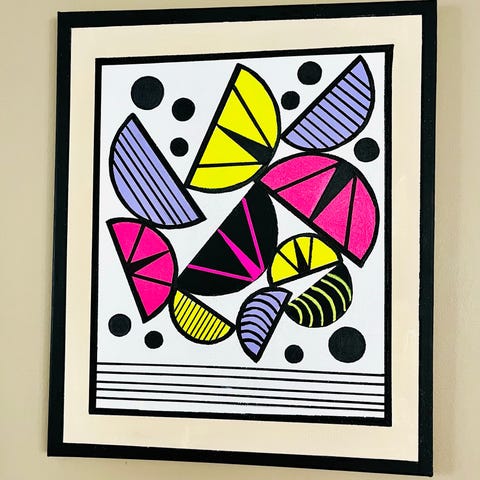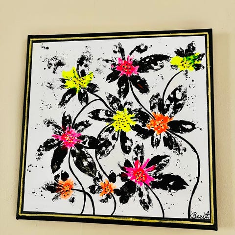Målningar av Berit Lundquist konstnär i akryl på duk. Motiven föreställer stiliserade frukter respektive blommor med tydliga svarta konturer mot ljus bakgrund. Färgerna är bland annat gul, röd, orange och grön. Passar som väggdekoration i exempelvis vardagsrum, kök eller hall. Säljs som två separata tavlor eller som ett par beroende på önskemål om upphängning.