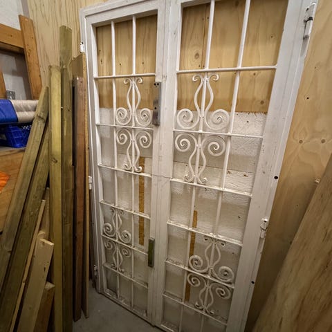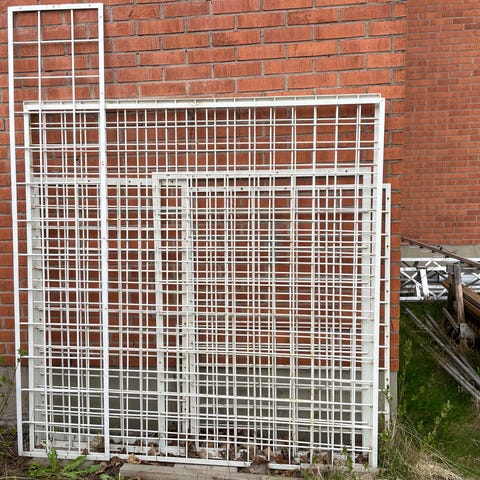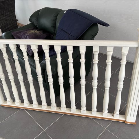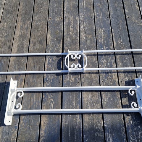 Vit grind i metall med dekorativa detaljer. Består av två sektioner med vertikala spjälor och svängda ornament. Passar exempelvis som avgränsning eller enkel säkerhetsgrind inomhus eller utomhus där måtten stämmer. Färg: vit. Material: metall.
