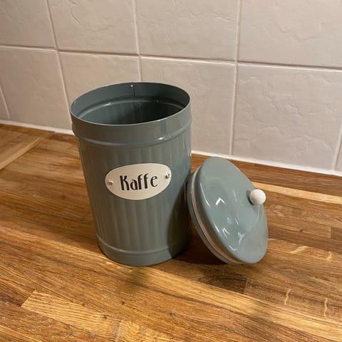 burk med lock i grå metall. Cylindisk form med knopp på locket. Passar för förvaring i kök, till exempel av torra livsmedel eller andra småsaker. Höjden framgår av måttbandet på bilden och kan användas som referens för storlek. Enkel att öppna och stänga med avtagbart lock.