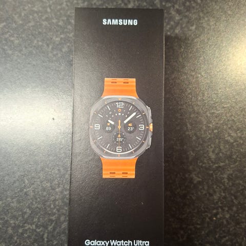 Samsung Galaxy Watch Ultra smartklocka i svart med rund pekskärm och silikonarmband. Klockan är utformad för användning tillsammans med kompatibla smartphones, främst inom Samsungs ekosystem. Den har sensorer på undersidan för bland annat pulsmätning. Laddkabel för magnetisk laddning syns på bilderna. Lämplig för vardagsanvändning, träning. Stöder eSIM