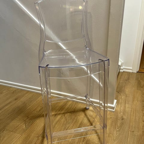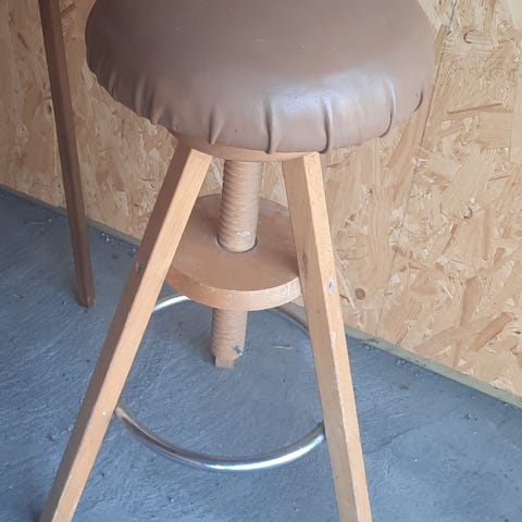 Barstol i brun träkonstruktion. Hög modell med fyrkantigt säte och ryggstöd med ribbor. Passar exempelvis till barbord eller köksö där en hög sittplats behövs.