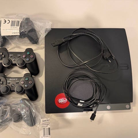 Sony Playstation 3 med handkontroll, hdmi kabel, strömkabel samt laddkabel till handkontroll.