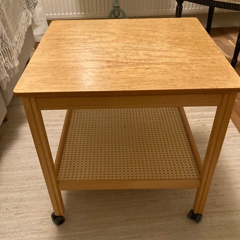 Trä bord som går att använda som soffbord och förvaring. Bordet har en diskret förvaring inuti (se bild) svarta detaljer och fina mönster. Små defekter (se bild)