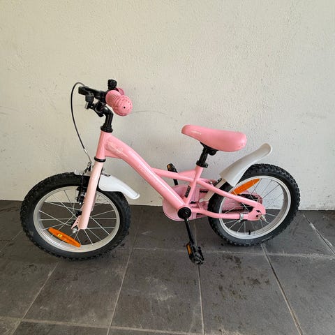 Barncykel med 16" hjul i rosa och vit färg. Utrustad med pakethållare bak, korg fram, kedjeskydd, stöd och reflexer. Passar mindre barn som behöver en cykel i 16-tumsstorlek för vardagscykling och lek.