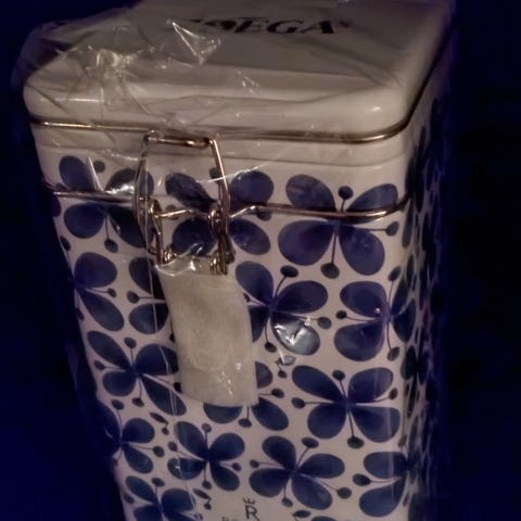 Zoégas burk i plåt med vit basfärg och blått blommigt mönster. Rektangulär form med lock och metallspänne. Lämplig för förvaring av kaffe, te eller andra torra livsmedel i kök eller skafferi, Mon Amie Marianne Westman