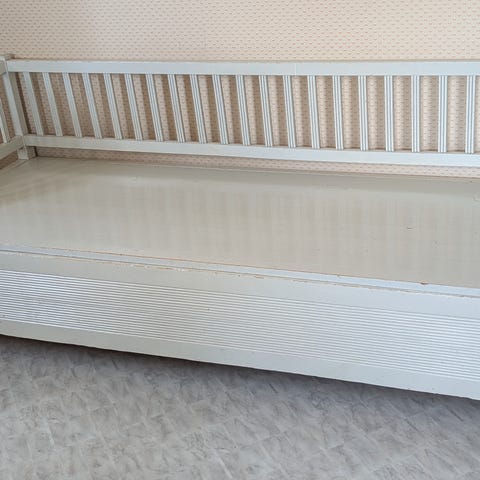 Gammal målad kökssoffa som är praktisk och smidig i storlek med bra förvaring under locket .