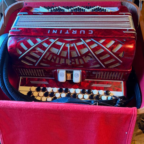 Dragspel i svart utförande med axelremmar. Tangentbord på ena sidan och bassektion på andra sidan. Medföljer hård väska med röd insida och brunt yttre, anpassad för förvaring och transport av instrumentet. Lämpligt för spel i hemmet, övning eller framträdanden där ett portabelt tangentinstrument behövs.