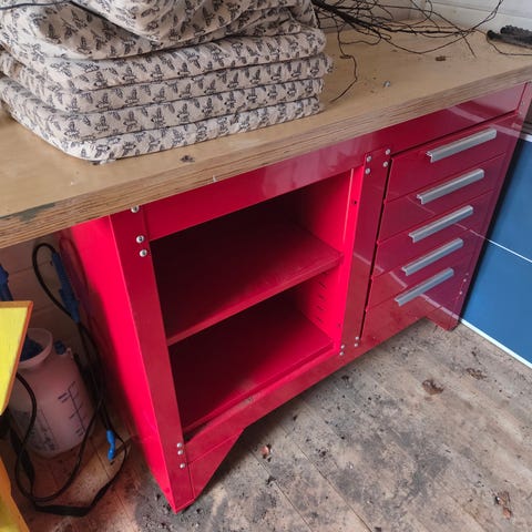Hopfällbar arbetsbänk med träskiva och svart metallstativ. Bänken har två separata skivor med hål för fastspänning av arbetsstycken. Lämplig som arbetsbord vid snickeri, hobbyarbeten och enklare reparationer. Kan fällas ihop för enkel förvaring när den inte används.