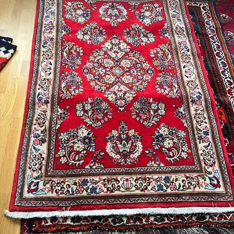 Persisk matta i flerfärgat orientinspirerat mönster. Rektangulär modell med fransar på kortsidorna.