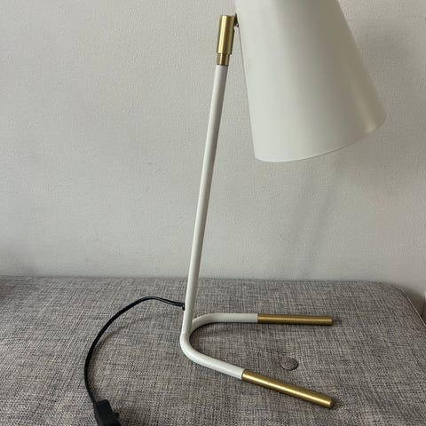 Superfina lampan Miller table från Rubn, perfekt arbetsbelysning på skrivbordet. Vit med mässingsdetaljer och svart sladd med av/på-knapp. Skärmen går att rikta i önskad position. Den vita modellen finns inte längre i produktion. Finns två mindre nagg/skav i färgen, se inringat på bild.