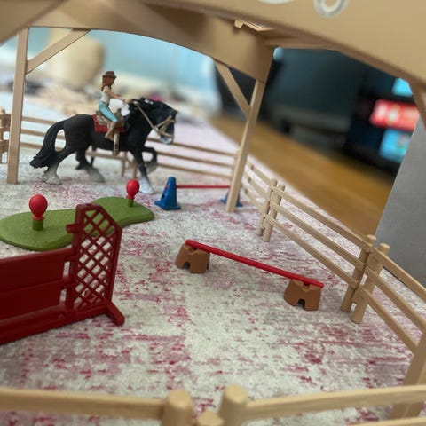Schleich hästsjukhus leksaksset med veterinärbil och häst. Setet består av en vit veterinärbil med öppningsbar sida och baklucka som fungerar som undersökningsrum. Invändigt finns bord, pall, dator och undersökningsutrustning. Tillbehör som medicinflaskor, sax, borste och andra små delar ingår. En hästfigur och en veterinärfigur följer med för att kunna leka veterinär och ta hand om hästar. Passar för barn som gillar djur- och stalllek.