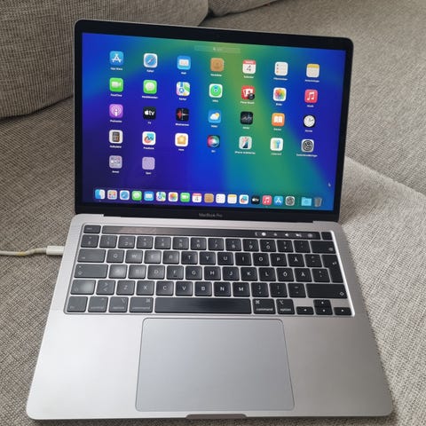 Apple MacBook Pro 13-tums laptop i silverfärg. Modellen har Retina-skärm och kör macOS Monterey. Processorn är en 2,7 GHz dual-core Intel Core i5 och datorn har 8 GB 1867 MHz DDR3-minne. Den integrerade grafiken är Intel Iris Graphics 6100 med 1536 MB. Datorn är utrustad med bakbelyst tangentbord, stor styrplatta och inbyggda högtalare. Nätadapter med laddkabel ingår. Batteriet 66 cykler i normalt skick.