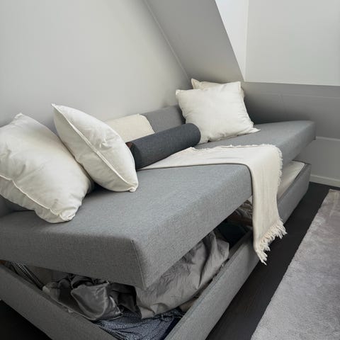IKEA bäddsoffa VALLENTUNA i ljusbeige färg. Soffan kan fällas ut till en säng med ribbotten i trä. Under den andra sitsen finns inbyggd förvaring som kan användas för exempelvis sängkläder eller kuddar. Passar som soffa och extrasäng i vardagsrum, gästrum eller mindre utrymmen där både sitt- och sovplats behövs.