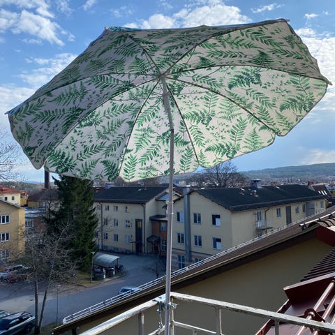 Parasolll med tilt i vit färg. Passar för användning i trädgård, på altan eller balkong för att ge skugga över sittgrupp eller bänk. Parasollet kan vinklas (tiltas) för att anpassa skuggan efter solens läge.