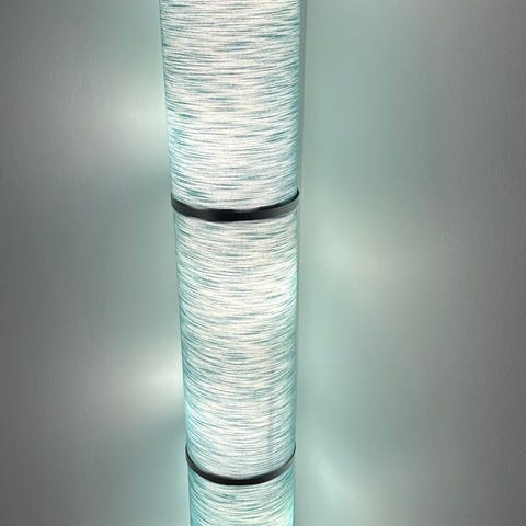 Taklampa och vägglampa. Vägglampan har cylindrisk form med skärm som sprider ljuset runtomkring. Taklampan är rektangulär, byter färg och är kontrollbar med en app.