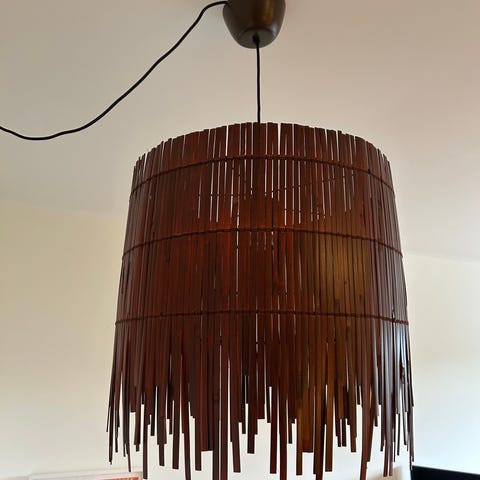 Taklampa/pendel med brun lamellskärm, komplett med upphängning. Normalt bruksskick, se bilder