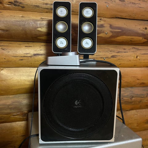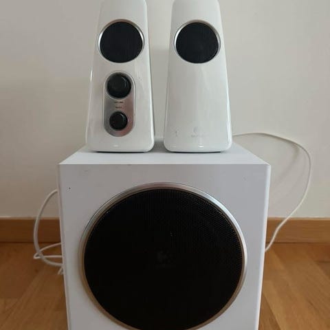 Logitech högtalarset med subwoofer. Består av två satellithögtalare, en subwoofer och en kontrollenhet. Anslutningskablar för ljud och ström ingår enligt bild. Systemet är avsett för användning med dator, TV eller annan ljudkälla med kompatibel anslutning.