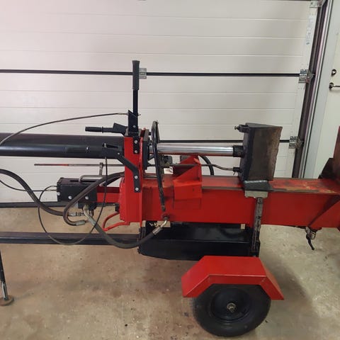 Maskinen är traktordriven och används för att klyva ved.
