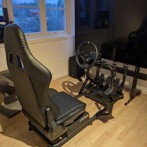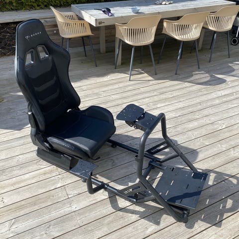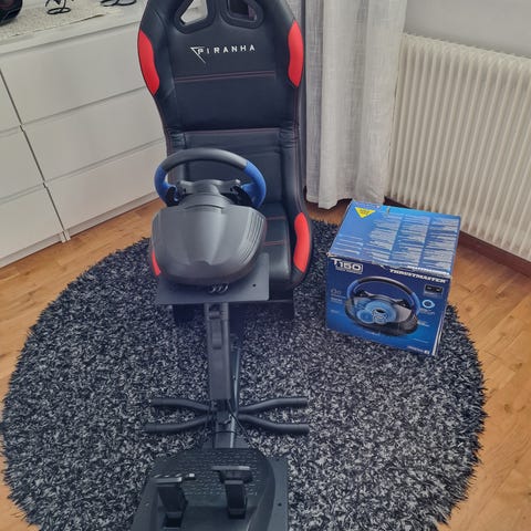 Piranha racingsäte med integrerat rattfäste och pedalställ i svart och röd färg. Sätet är utformat för bilspels- och racingsimulatorer och har monteringsplatta för ratt samt separat ställ för pedaler. Passar användare som vill ha en mer realistisk körställning vid spelande. Ratt och pedaler på bilden kan vara separat utrustning beroende på annonsens innehåll.