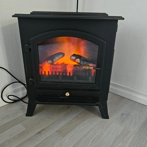 Elektrisk kamin i svart färg. Fristående modell med glasfront och dekorativa fejkligor. Placeras direkt på golv och ansluts till eluttag. Passar som värmekälla och för dekorativ belysning i inomhusmiljö.