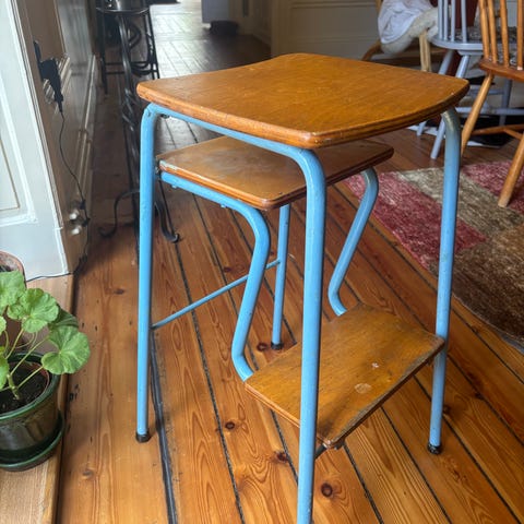 Pall med inbyggd stege i blåmålad metall. Övre plan fungerar som sitt- eller avställningsyta och under finns två steg som kan användas som liten hushållsstege. Passar till exempel i kök, förråd eller verkstad där både sittplats och extra räckvidd behövs.