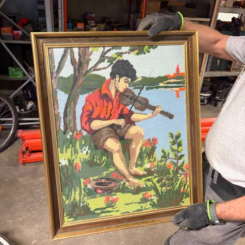 Tavla med målat landskapsmotiv som föreställer en slingrande väg genom grön natur, ett träd i förgrunden och ett litet hus vid vägkanten. Färgerna går huvudsakligen i grönt, gult och rosa toner. Motivet är inramat i en enkel ram. Passar som väggdekoration i till exempel vardagsrum, hall eller sovrum. 80%Recykling.