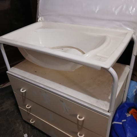 Man kan alltså lyfta av hylldelen och fälla ut ovandelen så blir det ett skötbord. Tror att man kan sätta på hyllan igen efter det. Just nu går den inte att fälla ut skötbordet eftersom den vikbara överdelen sitter ihop med underdelen pga målarfärg.