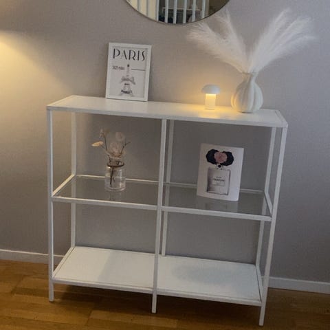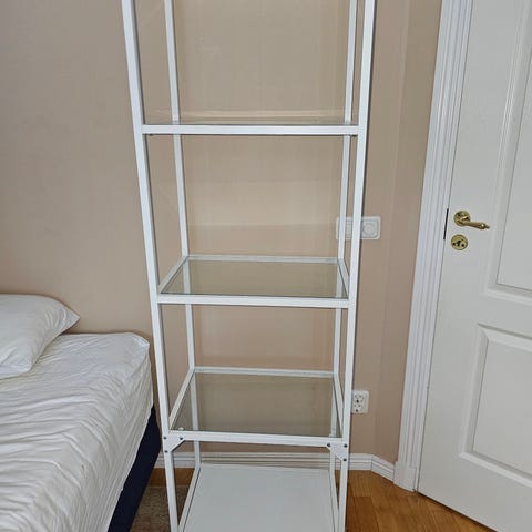 Hylla i stilren design med metallstomme och glashyllor som passar perfekt i vardagsrum, kontor eller sovrum. I gott skick. Hämtas på plats.
