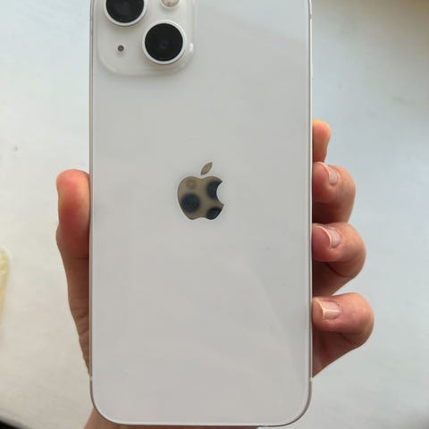 Apple iPhone 13 mobiltelefon med 128 GB lagringsutrymme. Modellen har dubbla bakre kameror, platt ram och skärm med sensorpanel överst. Färgtonen framstår som vit/ljus. Passar för vardaglig användning som samtal, meddelanden, surf, appar och fotografering. Stöd för nedladdning av appar via App Store och anslutning till trådlösa nätverk och mobildata beroende på operatör och abonnemang.