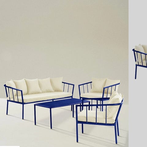 Modern utegrupp med soffa, bord och två bekväma fåtöljer