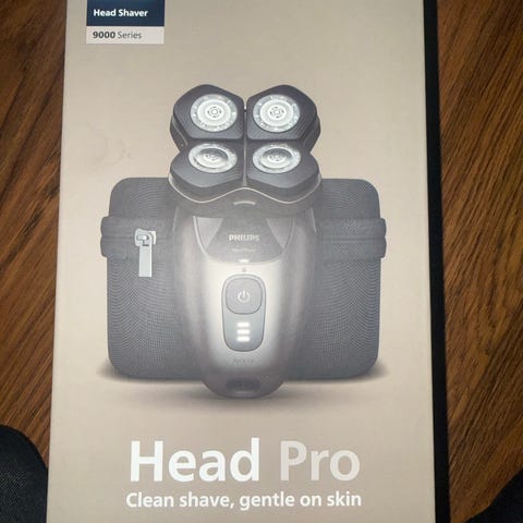 Philips 9000 Series Head Shaver Head Pro rakapparat för huvud. Modellen har fyra roterande skärhuvuden anpassade för rakning av huvudet. På bilden syns tillbehör som skyddslock, extra rakhuvud, laddkabel, förvaringsfodral och rengöringsborste. Rakapparaten är sladdlös och uppladdningsbar. Avsedd för torr- eller våtrakning av huvudet beroende på modellens specifikationer enligt tillverkaren.