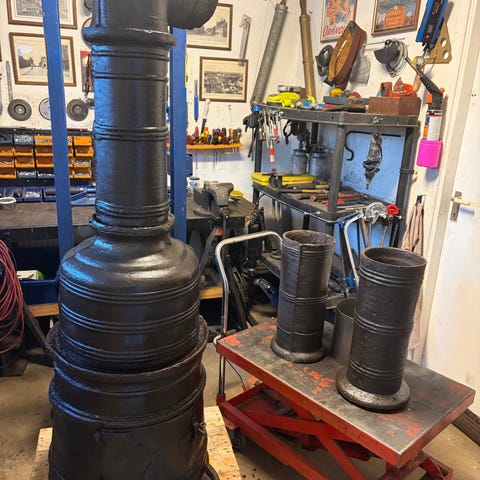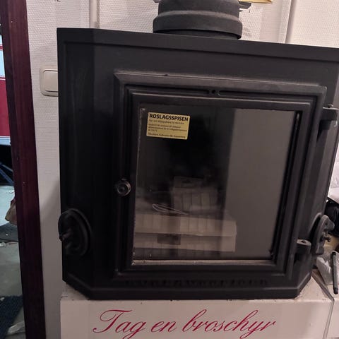 Har en roslagsspis lilla trekanten som står. Den är nyrenoverad och nylackerad. Anslutningsrör med följer.