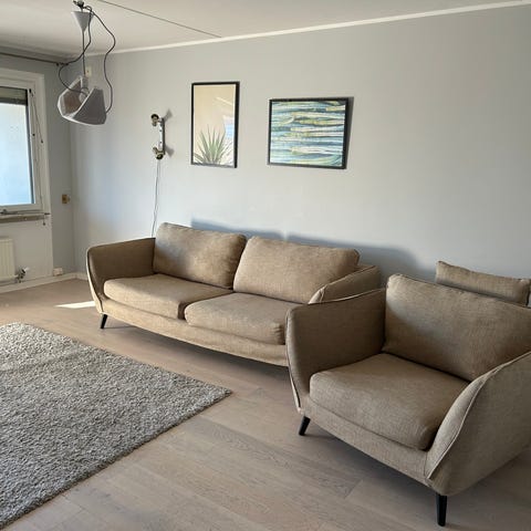 Soffgrupp County ifrån Mio, inköpt 2021. (Nypris 16000). Bekväm grupp med rymliga stolar i petro-blå. Säljes pga flytt, hund finns i hemmet.