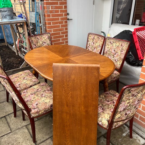 En fin matgrupp i mörkt trä och stoppade sitsar i stolarna, utdragbar skiva